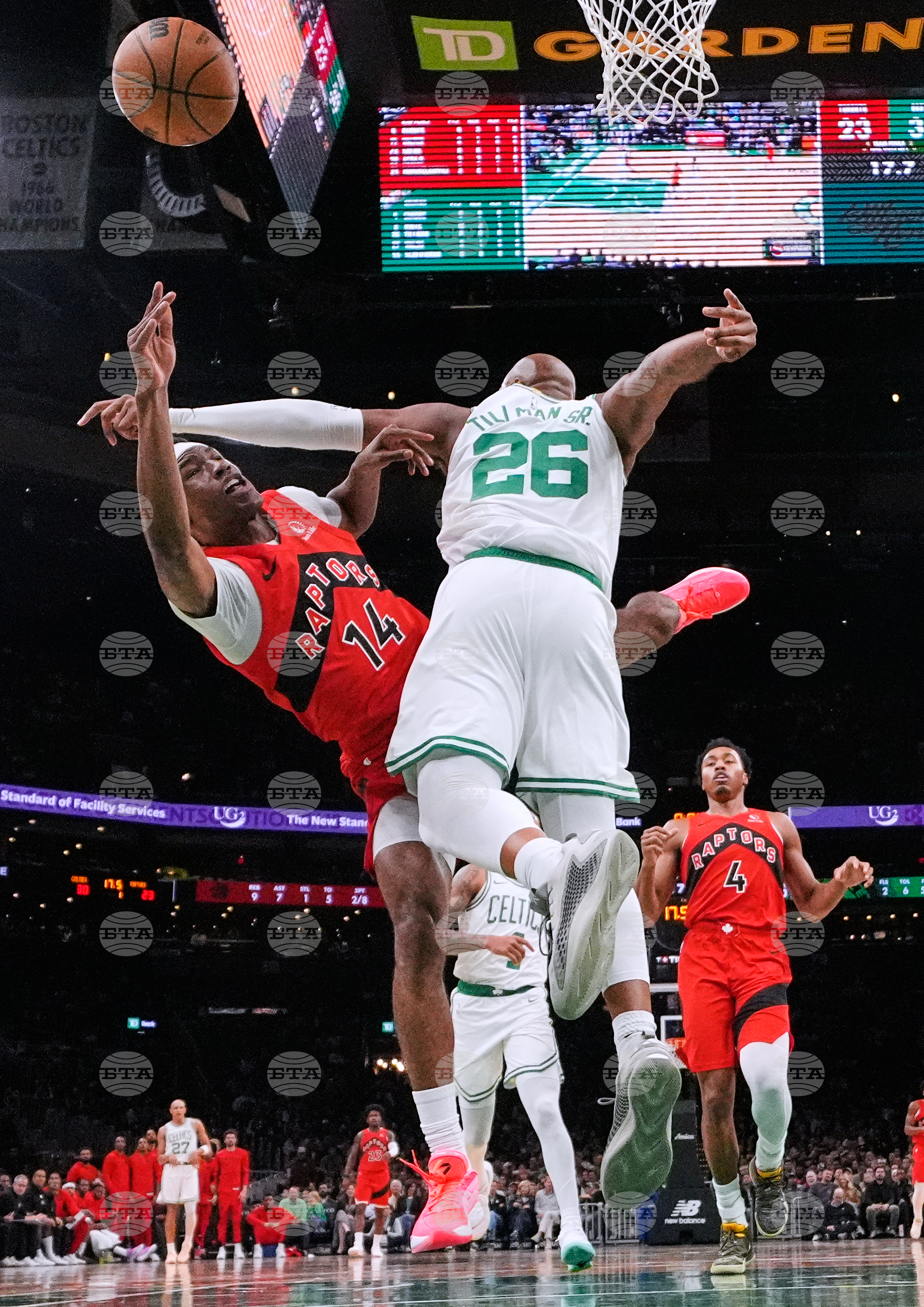Toronto Raptors guard Ja'Kobe Walter (14) is fouled by Boston Celtics forward Xavier Tillman (26) during the first half of a preseason NBA basketball game, Wednesday, Oct. 15, 2025, in Boston. (AP Photo/Charles Krupa)