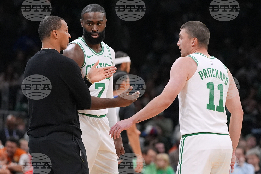 Boston Celtics head coach Joe Mazzulla, left, talks with forward Jaylen Brown (7) and guard Payton Pritchard (11) during the first half of a preseason NBA basketball game against the Toronto Raptors, Wednesday, Oct. 15, 2025, in Boston. (AP Photo/Charles Krupa)