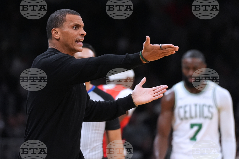 Toronto Raptors head coach Darko Rajakovic calls to his players during the first half of a preseason NBA basketball game against the Boston Celtics, Wednesday, Oct. 15, 2025, in Boston. (AP Photo/Charles Krupa)