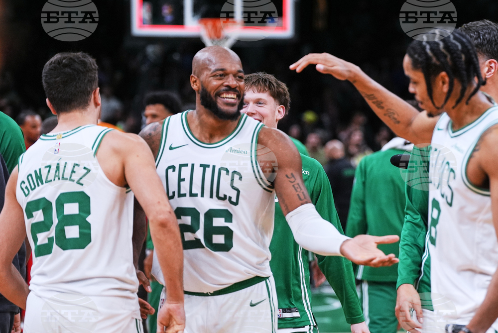 Boston Celtics forward Xavier Tillman (26) is congratulated by teammates after his game-winning shot against the Toronto Raptors after a preseason NBA basketball game, Wednesday, Oct. 15, 2025, in Boston. (AP Photo/Charles Krupa)