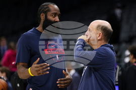 Los Angeles Clippers guard James Harden, left, speaks with assistant coach Jeff Van Gundy, right, before an NBA basketball preseason game against the Sacramento Kings, Wednesday, Oct. 15, 2025, in Sacramento, Calif. (AP Photo/Scott Marshall)