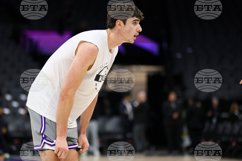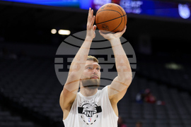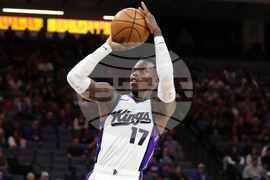 Sacramento Kings center Domantas Sabonis shoots before an NBA basketball preseason game against the Los Angeles Clippers, Wednesday, Oct. 15, 2025, in Sacramento, Calif. (AP Photo/Scott Marshall)