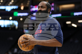 Los Angeles Clippers guard James Harden looks on before an NBA basketball preseason game against the Sacramento Kings, Wednesday, Oct. 15, 2025, in Sacramento, Calif. (AP Photo/Scott Marshall)