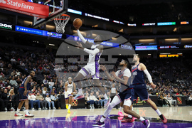 Sacramento Kings guard Dennis Schröder, center, makes a layup during the first half of an NBA basketball preseason game against the Los Angeles Clippers, Wednesday, Oct. 15, 2025, in Sacramento, Calif. (AP Photo/Scott Marshall)