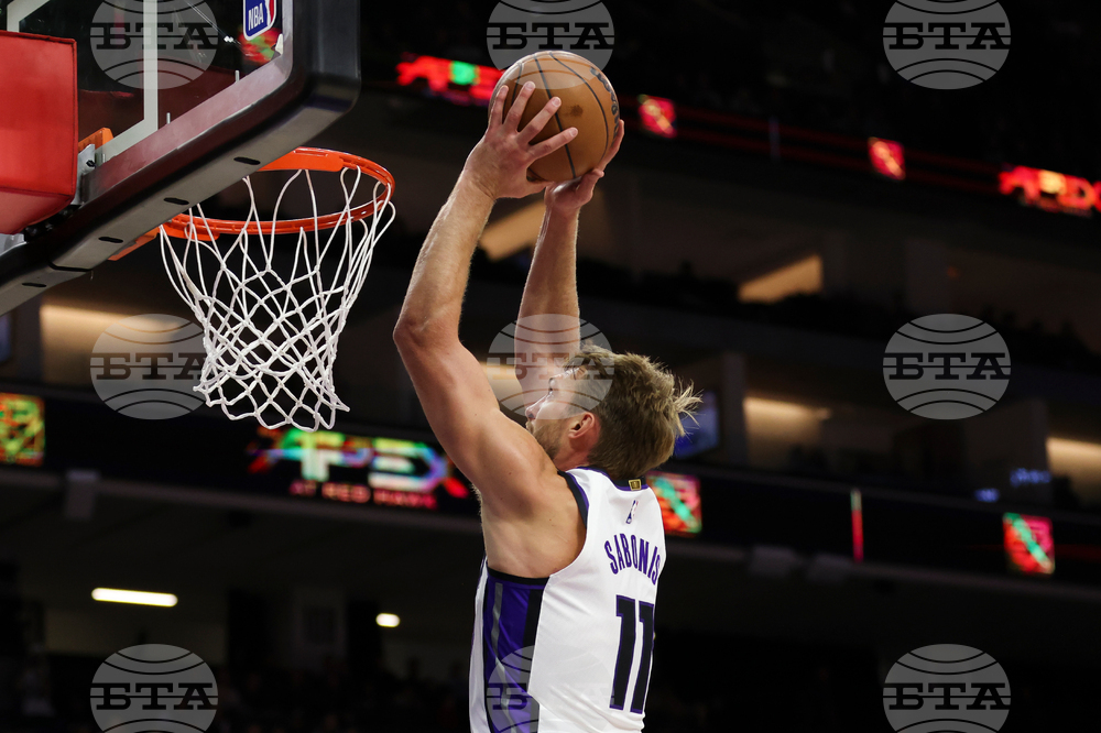 Sacramento Kings center Domantas Sabonis dunks the ball during the first half of an NBA basketball preseason game against the Los Angeles Clippers, Wednesday, Oct. 15, 2025, in Sacramento, Calif. (AP Photo/Scott Marshall)