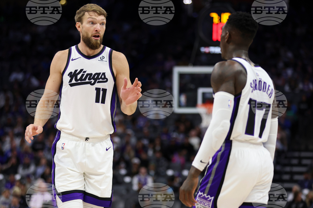 Sacramento Kings center Domantas Sabonis (11) and guard Dennis Schröder (17) talk during the first half of an NBA basketball preseason game against the Los Angeles Clippers, Wednesday, Oct. 15, 2025, in Sacramento, Calif. (AP Photo/Scott Marshall)