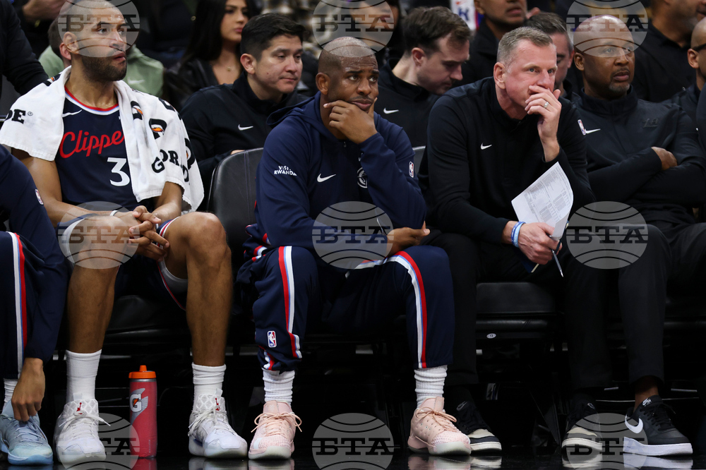 Los Angeles Clippers guard Chris Paul, middle, looks on from the bench during the first half of an NBA basketball preseason game against the Sacramento Kings, Wednesday, Oct. 15, 2025, in Sacramento, Calif. (AP Photo/Scott Marshall)