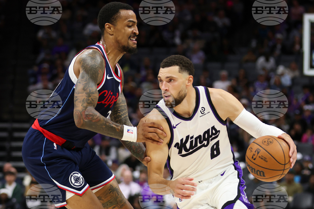 Sacramento Kings guard Zach Lavine (8) dribbles by Los Angeles Clippers forward John Collins, left, during the first half of an NBA basketball preseason game Wednesday, Oct. 15, 2025, in Sacramento, Calif. (AP Photo/Scott Marshall)