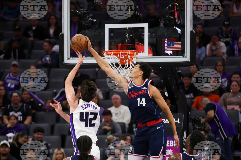 Los Angeles Clippers center Yanic Konan Niederhäuser (14) blocks Sacramento Kings center Maxime Raynaud (42) during the second half of an NBA basketball preseason game Wednesday, Oct. 15, 2025, in Sacramento, Calif. (AP Photo/Scott Marshall)