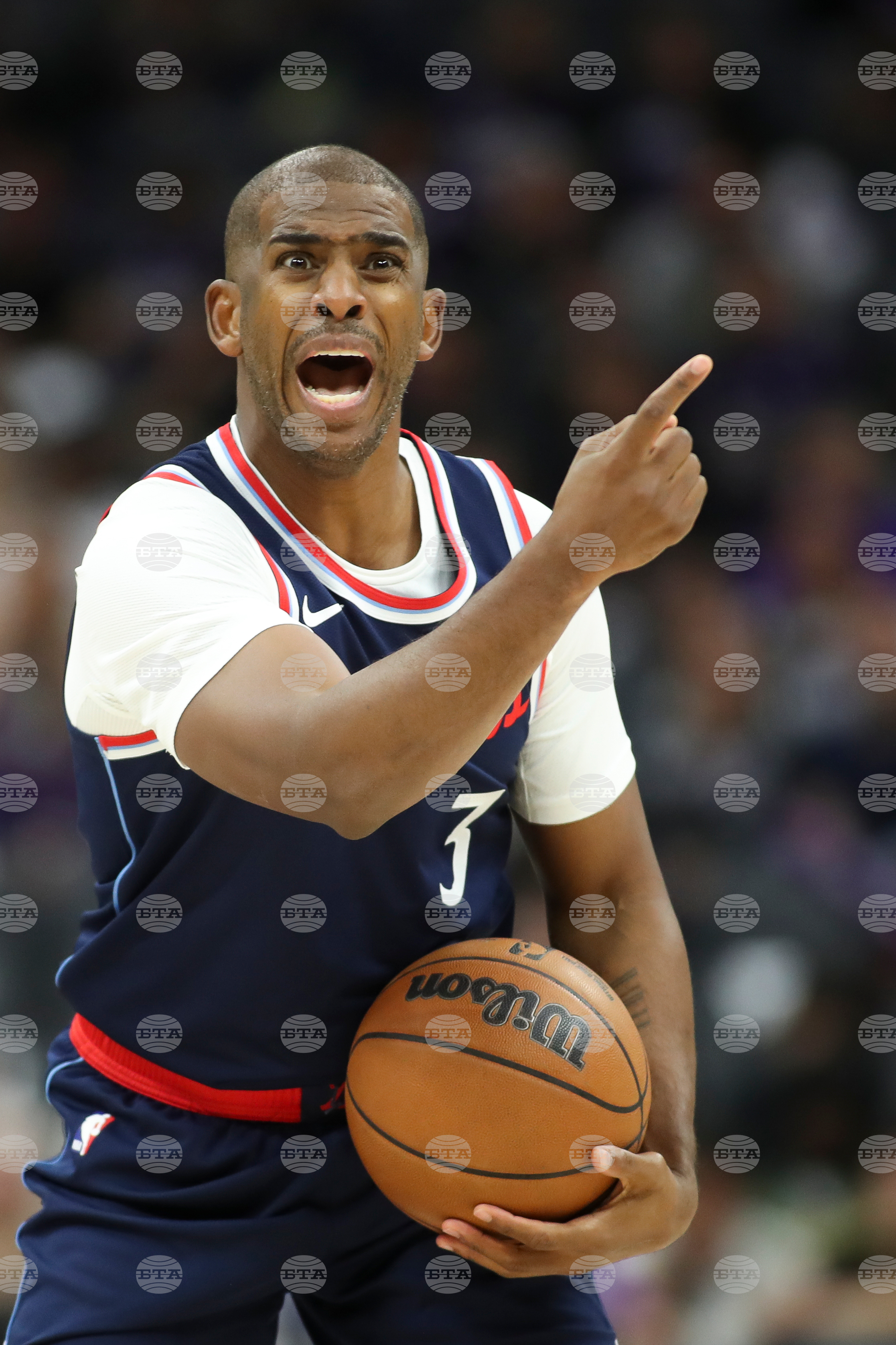 Los Angeles Clippers guard Chris Paul directs his teammates during the second half of an NBA basketball preseason game against the Sacramento Kings, Wednesday, Oct. 15, 2025, in Sacramento, Calif. (AP Photo/Scott Marshall)
