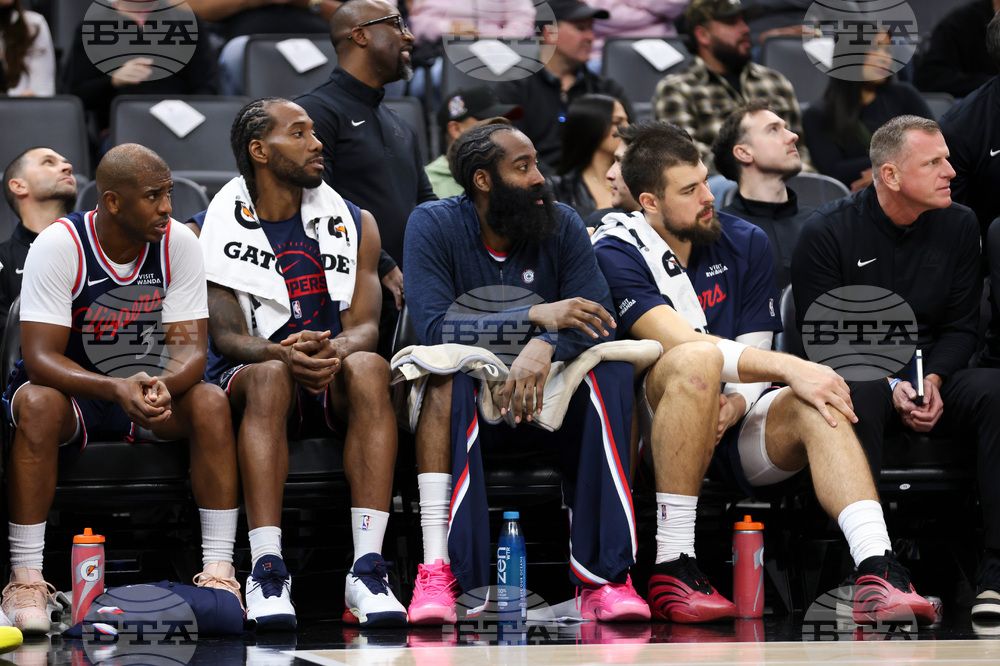 From left, Los Angeles Clippers guard Chris Paul, forward Kawhi Leonard, guard James Harden, and center Ivica Zubac look on from the bench during the second half of an NBA basketball preseason game against the Sacramento Kings, Wednesday, Oct. 15, 2025, in Sacramento, Calif. (AP Photo/Scott Marshall)