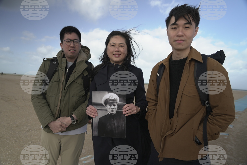 Angus Hui, right, and John Mak, left, pose with Sau Ying Lam, holding a photo of her father Lam Ping-yu, on the beach in Ouistreham, France, Saturday Oct. 4, 2025. (AP Photo/John Leicester)