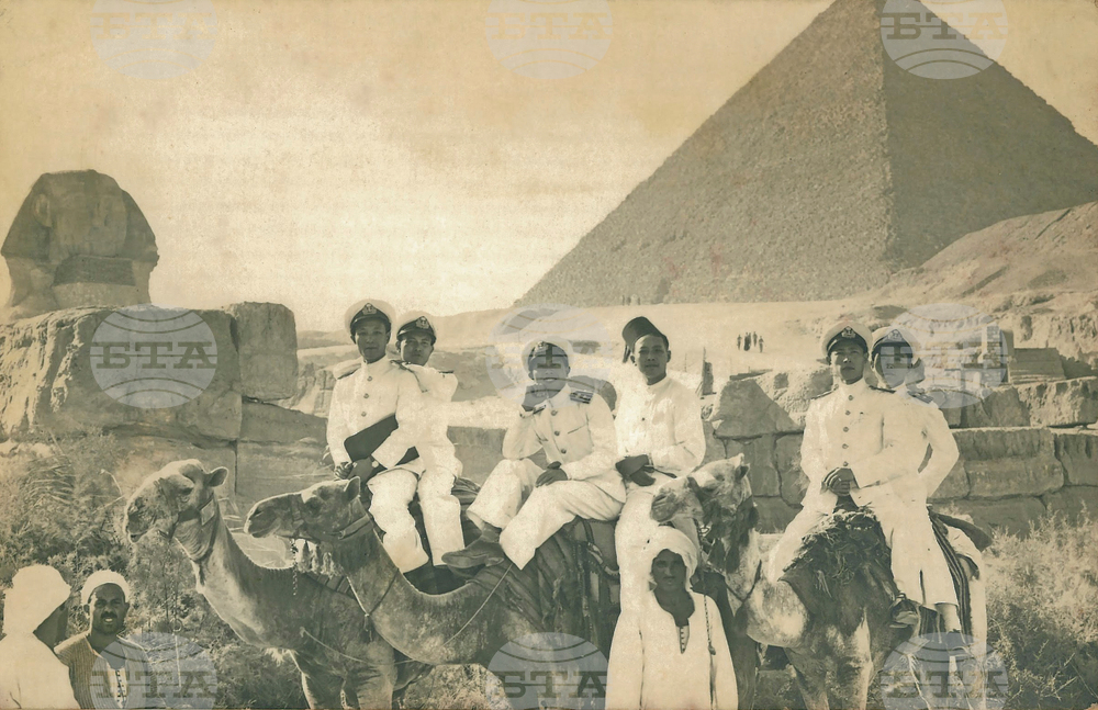 This handout photo provided by Huang Shansong, son of Huang Tingxin, one of the 24 officers sent to Britain, Chinese naval officers pose for a photo in front of a pyramid on Sept. 8, 1943, in Egypt during their journey to Britain for training. (Huang Shansong via AP)