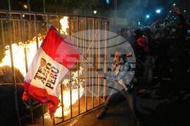 A demonstrator waves a Peruvian flag as a cardboard doll burns in front of Congress during a protest against new President Jose Jeri in Lima, Peru, Wednesday, Oct. 15, 2025. (AP Photo/Martin Mejia)