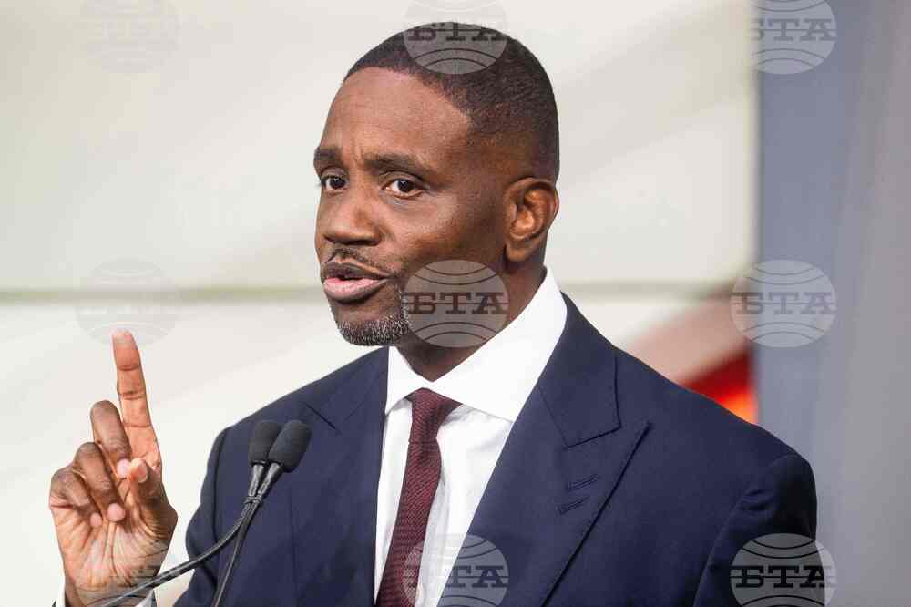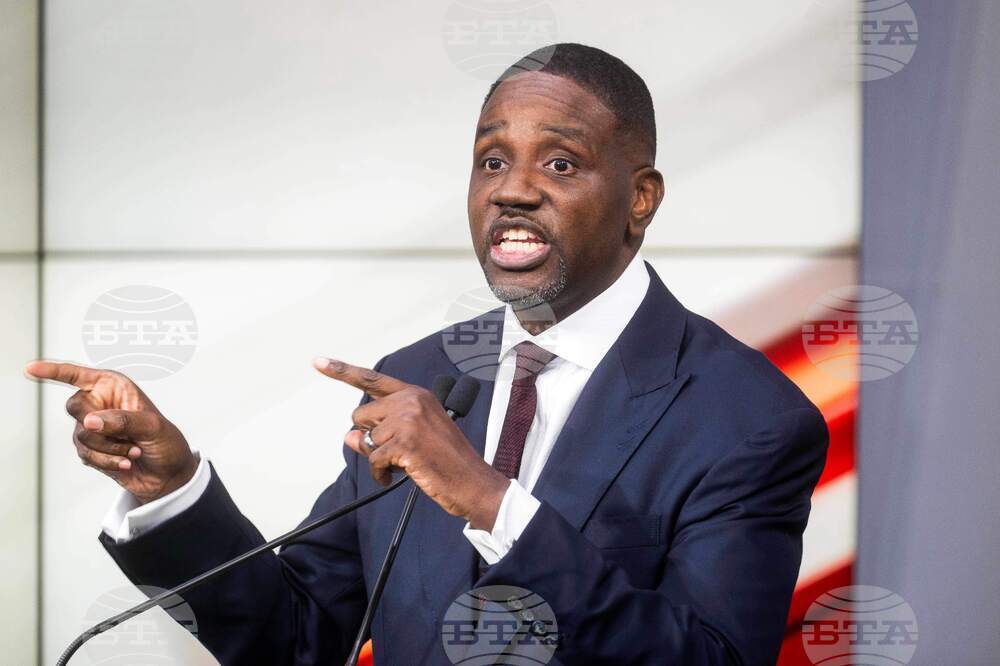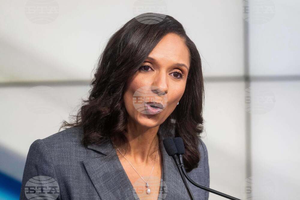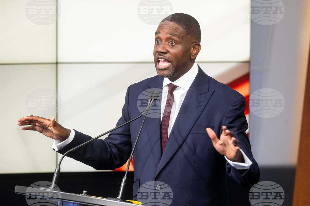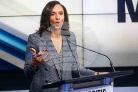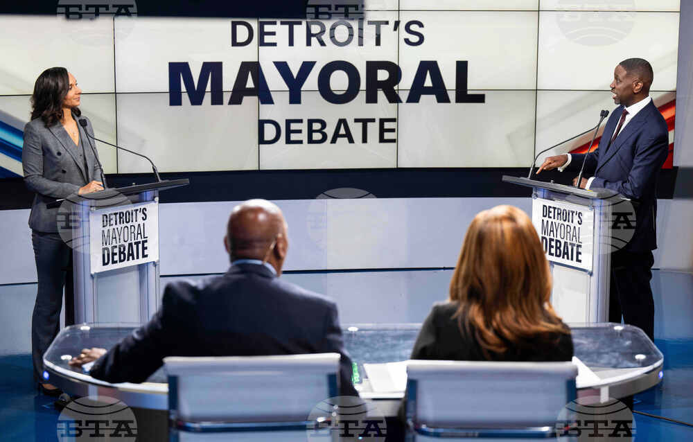 Solomon Kinloch Jr. faces off against Detroit City Council President Mary Sheffield in a televised debate between the two remaining candidates in Detroit's mayoral race on Wednesday, Oct. 15, 2025, at the WXYZ-TV studio in Southfield, Mich. (Katy Kildee/Detroit News via AP)