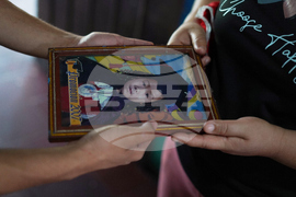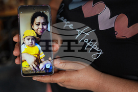 Carmen Gavidia Ramírez shows a portrait of her sister Maribel Ramírez and her nephew Evan, who died in a traffic accident in Jackson County, Georgia, at her home in Tepetitan, El Salvador, Wednesday, Oct. 15, 2025. (AP Photo/Salvador Melendez)