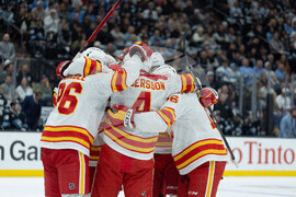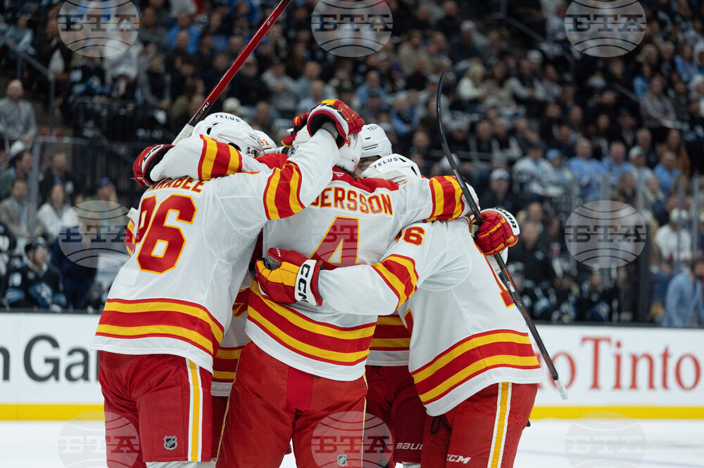 Calgary Flames celebrate the goal against the Utah Mammoth during the first half of an NHL hockey game Wednesday, October. 15, 2025, in Salt Lake City. (AP Photo/Melissa Majchrzak)