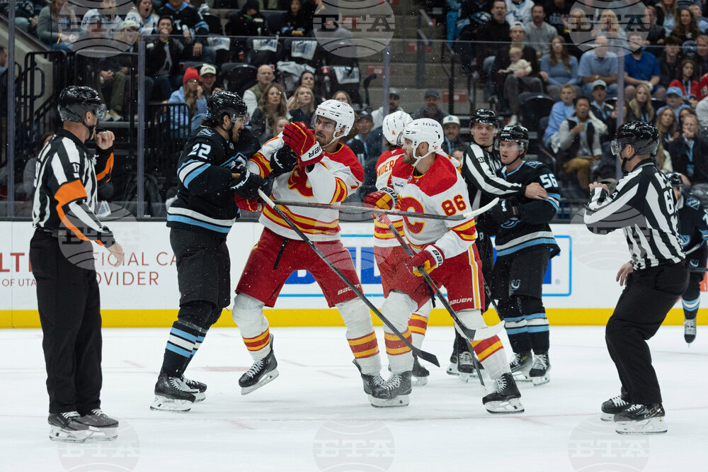 Utah Mammoth center Jack McBain (22) fights Calgary Flames defenseman Kevin Bahl (7) during the second half of an NHL hockey game Wednesday, Oct. 15, 2025, in Salt Lake City. (AP Photo/Melissa Majchrzak)