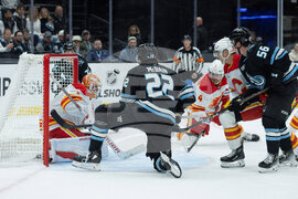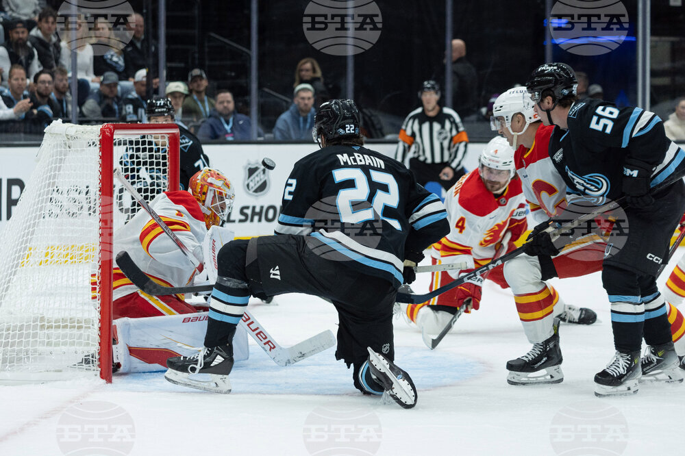 Calgary Flames goaltender Devin Cooley (1) watches the puck fly against Utah Mammoth center Jack McBain (22) during the second half of an NHL hockey game Wednesday, Oct. 15, 2025, in Salt Lake City. (AP Photo/Melissa Majchrzak)