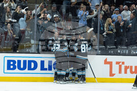 Utah Mammoth Celebrate the goal against the Calgary Flames during the second half of an NHL hockey game Wednesday, Oct. 15, 2025, in Salt Lake City. (AP Photo/Melissa Majchrzak)