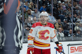 Calgary Flames defenseman MacKenzie Weegar (52) reacts to the referee during the second half against the Utah Mammoth at an NHL hockey game Wednesday, Oct. 15, 2025, in Salt Lake City. (AP Photo/Melissa Majchrzak)