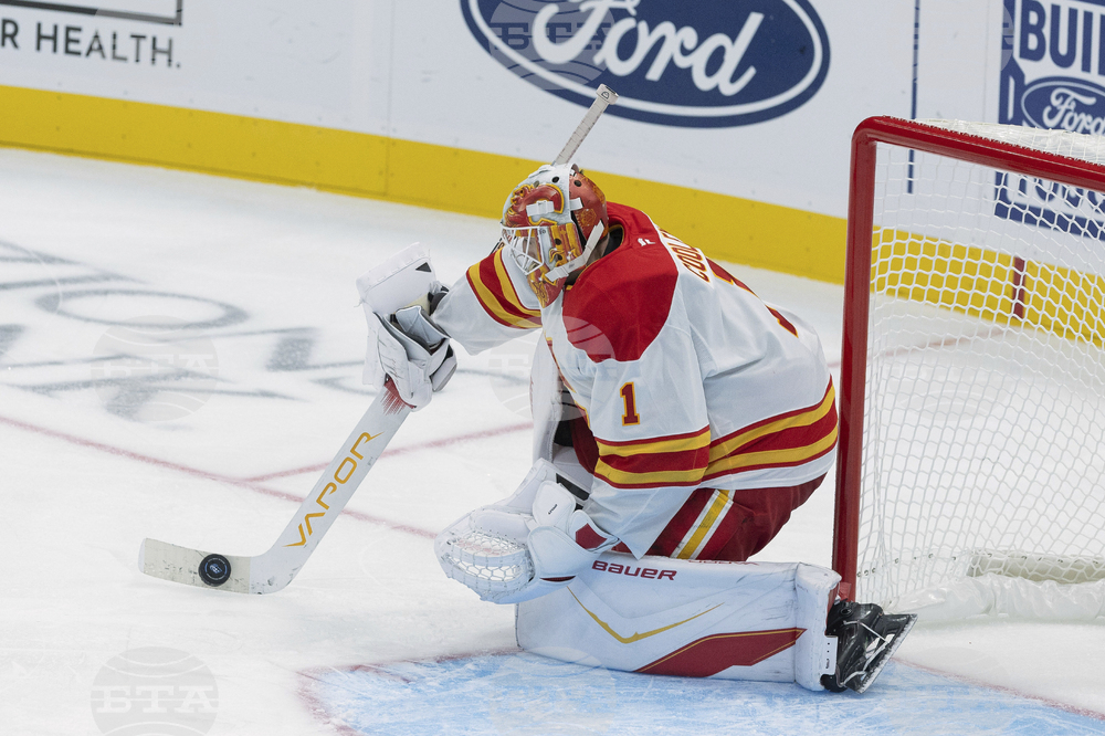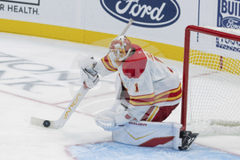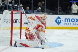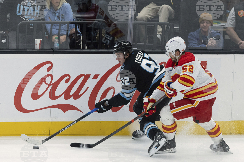 Calgary Flames goaltender Devin Cooley (1) during defends the goal against the Utah Mammoth during the second half of an NHL hockey game Wednesday, Oct. 15, 2025, in Salt Lake City. (AP Photo/Melissa Majchrzak)