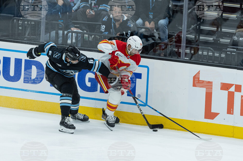 Utah Mammoth left wing Brandon Tanev (13) goes after the puck against Calgary Flames defensemen Brayden Pachal (94), Zayne Parekh (19) and goaltender Devin Cooley (1) during the third period of an NHL hockey game Wednesday, Oct. 15, 2025, in Salt Lake City. (AP Photo/Melissa Majchrzak)