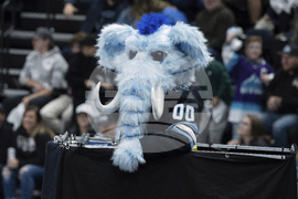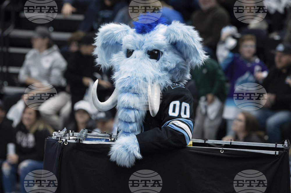 Utah Mammoths mascot Tusky (00) hypes up the crowd during the third period of an NHL hockey game against the Calgary Flames, Wednesday, Oct. 15, 2025, in Salt Lake City. (AP Photo/Melissa Majchrzak)