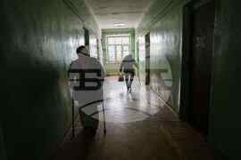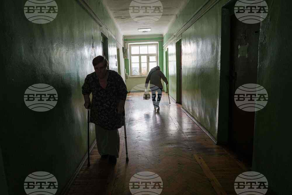 Elderly women walk in a corridor at a hostel for the displaced in Dnipro, Ukraine, Wednesday, Oct. 8, 2025. (AP Photo/Evgeniy Maloletka)