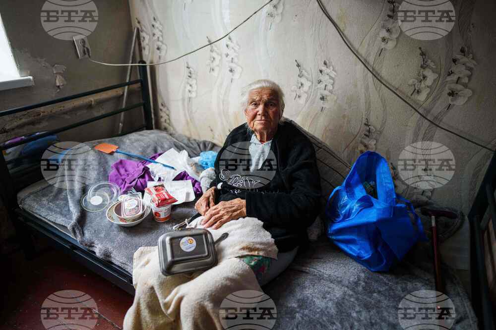 Olha, 81, sits on her bed at a hostel for the displaced in Dnipro, Ukraine, Wednesday, Oct. 8, 2025. (AP Photo/Evgeniy Maloletka)
