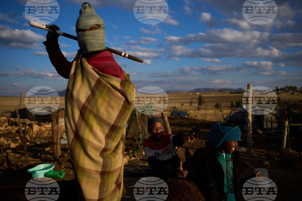 Boys stand outside their homes after a day of work in Mafeteng, Lesotho, July 12, 2025. (AP Photo/Bram Janssen)