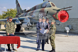 Крумово (16 октомври 2025) Деня на авиацията и Военновъздушните сили се отбелязва в Музея на авиацията край Пловдив, филиал на Националния военноисторически музей. Празничната програма започна с тържествен строй с участието на военнослужещи от 24 авиобаза - Крумово. По повод празника бяха отличени военнослужещи от авиобазата. Посетителите на музея ще имат възможност днес да разгледат отвътре пилотската кабина и салона на един от атрактивните експонати във външната експозиция на Музея - самолет Ан-2. На снимката: подполковник Пламен Дончев връчва отличия.