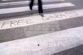 A woman walks on a zebra crossing with a graffiti from an earlier demonstration in support of Palestinians in Rome, Thursday, Oct. 16, 2025. (AP Photo/Gregorio Borgia)