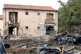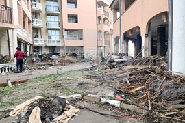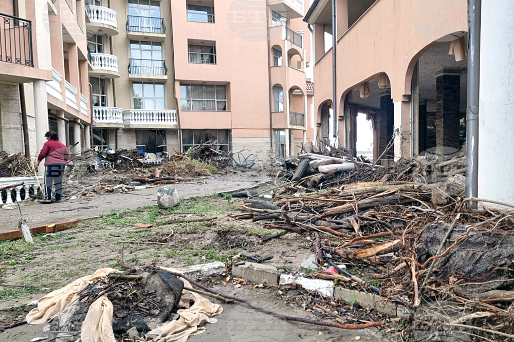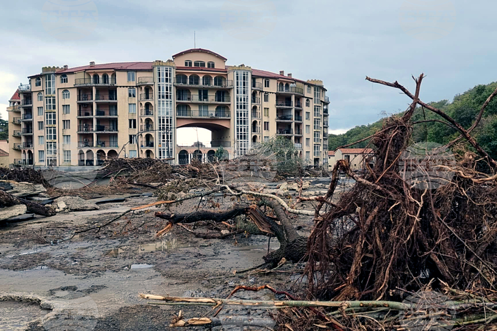 Ваканционно селище „Елените“ (16 октомври 2025) Тринадесети ден след природната стихия, засегнала ваканционно селище „Елените“, продължават възстановителните дейности в курорта от кал, наноси, изкоренени дървета, останки от повредени постройки и завлечени от водата коли.