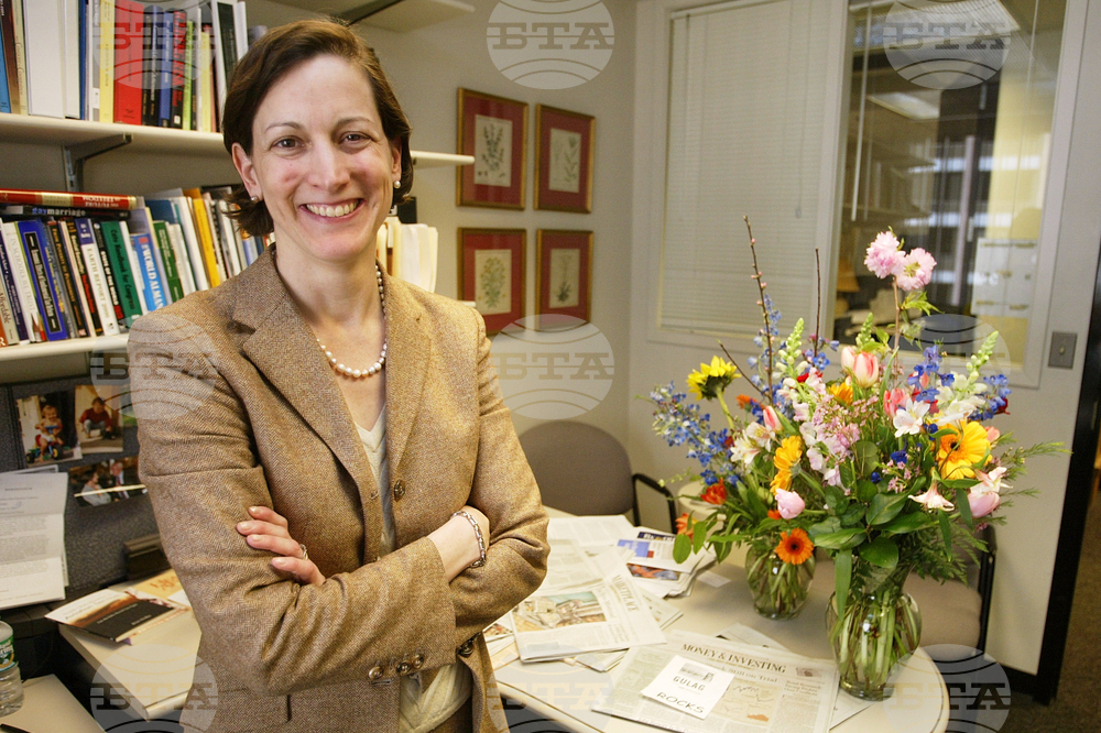 FILE - Anne Applebaum poses for a photograph at her office at the Washington Post after being awarded the Pulitzer Prize for general nonfiction for her book "Gulag: A History," on April 5, 2004. (AP Photo/Charles Dharapak, File)