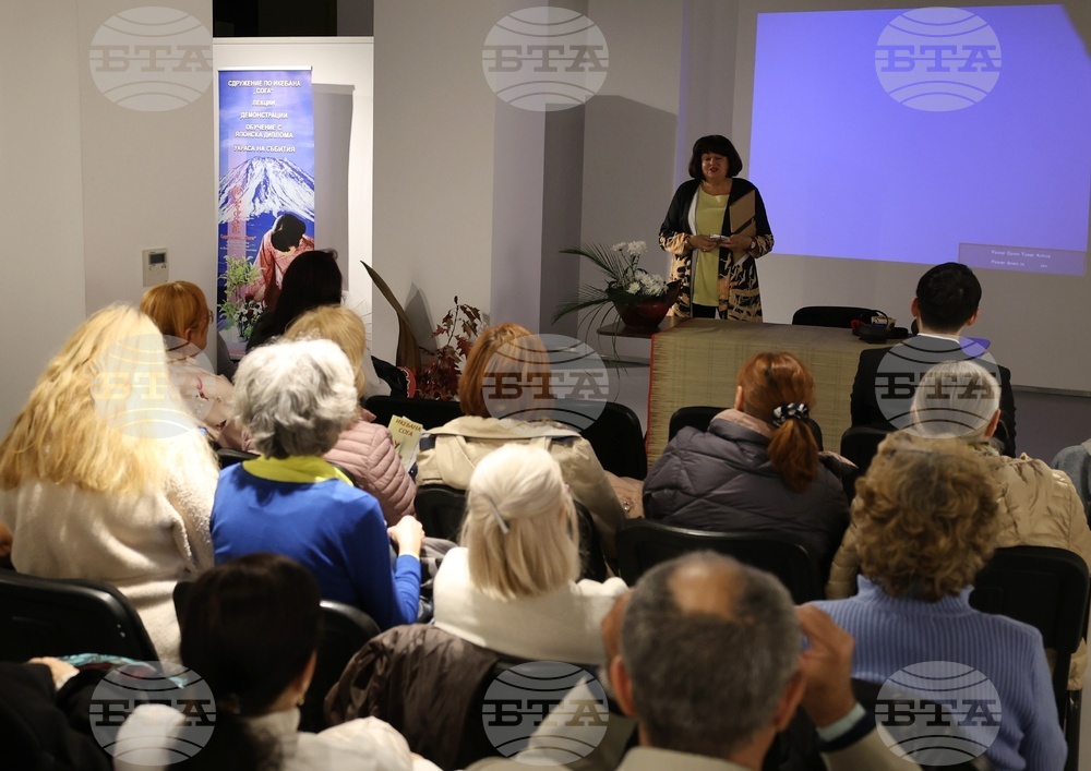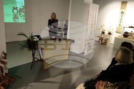 София (16 октомври 2025) В Триъгълна кула Сердика – РИМ, школа за икебана СОГА и Сдружение за популяризиране на японската култура „Урасенке“ организират изложба „Полъх от Япония“, където се представя изложба и лекция за икебана демонстрация на чаена церемония и лекция „Красотата на чаените прибори“, хайку поезия и лекция „Японското изкуство и влияние на религиозни, философски и обществени фактори“. На снимката: председателят на Асоциацията за завършилите Токайския университет в България Биляна Станойлович (вляво).