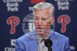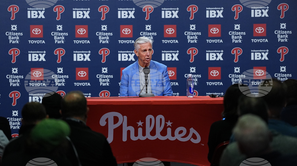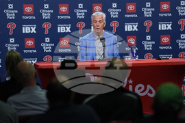 Philadelphia Phillies president of baseball operations Dave Dombrowki speaks during a news conference, Thursday, Oct. 16, 2025, in Philadelphia. (AP Photo/Matt Rourke)