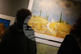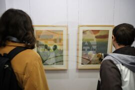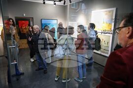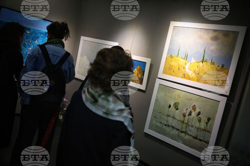 Бургас (16 октомври 2025) Художникът Ивайло Мирчев (вляво) представя самостоятелна изложба живопис под надслов „Параклис”. Домакин на експозицията е Художествена галерия „Пролет”. На снимката: Фоти Фотев (вдясно).