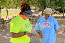 FILE - Erika Hardwick, left, a paid canvasser with the New Georgia Project Action Fund, shares literature with Patricia Lee and urges her to vote, Oct. 5, 2022, in Dawson, Ga. (AP Photo/Jeff Amy, File)