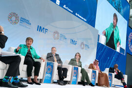 CORRECTS SPELLING OF NAME TO AL-JADAAN - International Monetary Fund (IMF) Managing Director Kristalina Georgieva, from left, Professor of Entrepreneurship at the MIT Sloan School of Management Simon Johnson, President and Chief Investment Officer, Alphabet and Google Ruth Porat, Saudi Arabia's Finance Minister Mohammed Al-Jadaan and Founder and Chairman, Heirs Holdings Tony Elumelu speak at Boosting Productivity Growth in the Digital Age conference during the World Bank/IMF Annual Meetings at the International Monetary Fund (IMF) headquarters in Washington, Wednesday, Oct. 15, 2025. (AP Photo/Jose Luis Magana)