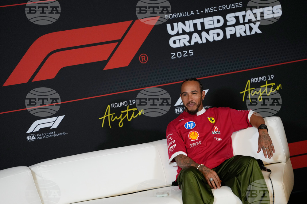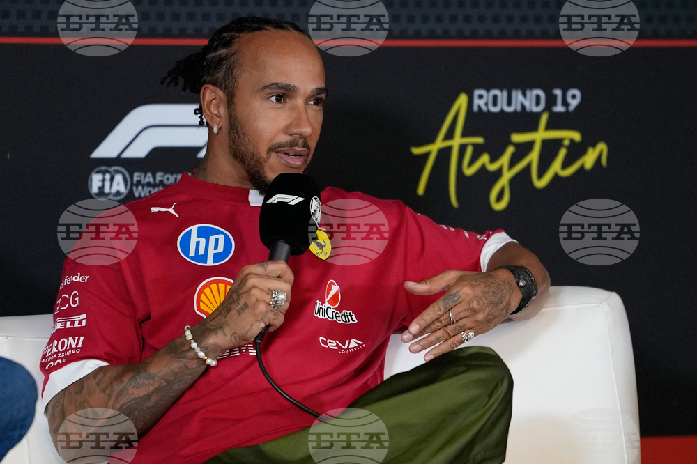 Ferrari driver Lewis Hamilton of Great Britain attends a news conference for the Formula One U.S. Grand Prix auto race at the Circuit of the Americas, Thursday, Oct. 16, 2025, in Austin, Texas. (AP Photo/John Locher)