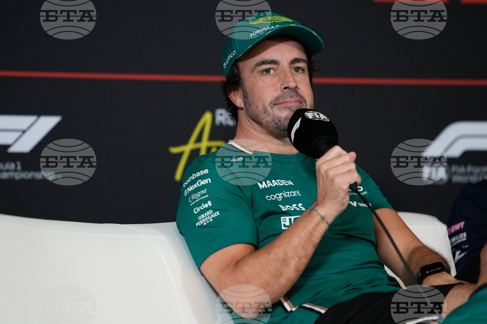 Aston Martin driver Fernando Alonso of Spain speaks during a news conference for the Formula One U.S. Grand Prix auto race at the Circuit of the Americas, Thursday, Oct. 16, 2025, in Austin, Texas. (AP Photo/John Locher)