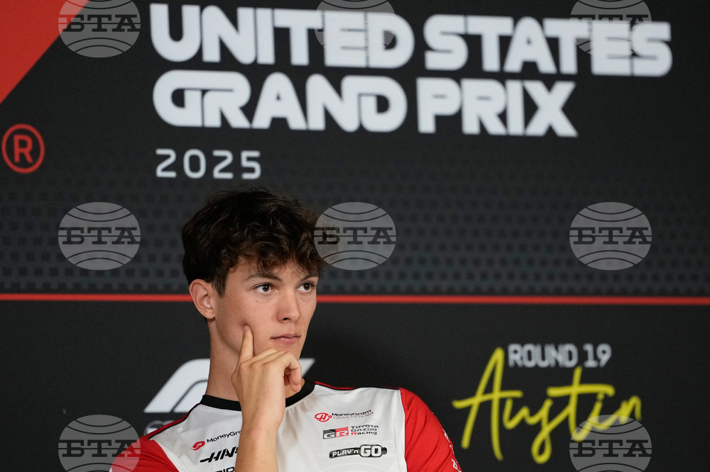 Haas driver Oliver Bearman of Great Britain speaks listens a news conference for the Formula One U.S. Grand Prix auto race at the Circuit of the Americas, Thursday, Oct. 16, 2025, in Austin, Texas. (AP Photo/John Locher)