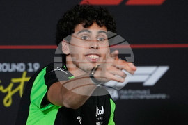 Kick Sauber driver Gabriel Bortoleto of Brazil motions during a news conference for the Formula One U.S. Grand Prix auto race at the Circuit of the Americas, Thursday, Oct. 16, 2025, in Austin, Texas. (AP Photo/John Locher)