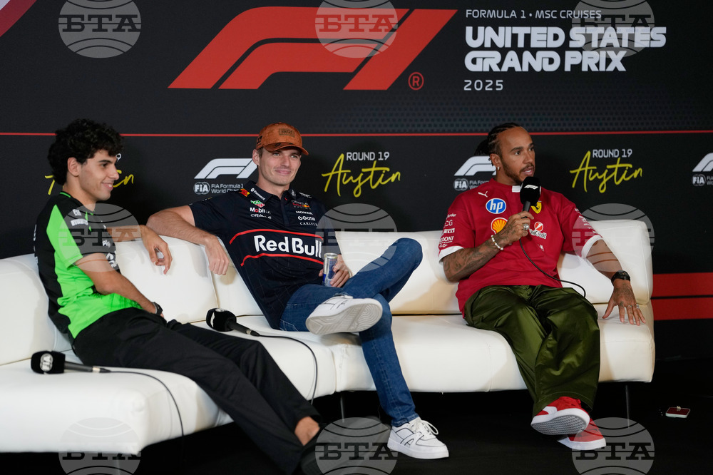 From left, Kick Sauber driver Gabriel Bortoleto of Brazil, Red Bull driver Max Verstappen of the Netherlands, and Ferrari driver Lewis Hamilton of Great Britain attend a news conference for the Formula One U.S. Grand Prix auto race at the Circuit of the Americas, Thursday, Oct. 16, 2025, in Austin, Texas. (AP Photo/John Locher)