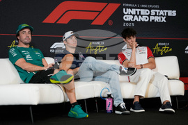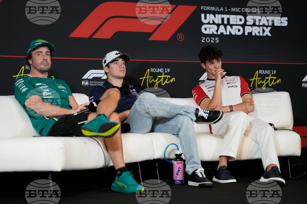 From left, Aston Martin driver Fernando Alonso of Spain, Alpine driver Franco Colapinto of Argentina, and Haas driver Oliver Bearman of Great Britain attend a news conference for the Formula One U.S. Grand Prix auto race at the Circuit of the Americas, Thursday, Oct. 16, 2025, in Austin, Texas. (AP Photo/John Locher)