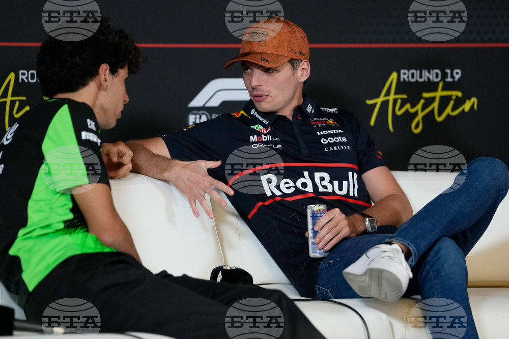 Kick Sauber driver Gabriel Bortoleto of Brazil, left, and Red Bull driver Max Verstappen of the Netherlands speak during a news conference for the Formula One U.S. Grand Prix auto race at the Circuit of the Americas, Thursday, Oct. 16, 2025, in Austin, Texas. (AP Photo/John Locher)