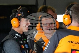 McLaren driver Lando Norris of Great Britain talks with his crew before a practice session the Formula One U.S. Grand Prix auto race at the Circuit of the Americas, Friday, Oct. 17, 2025, in Austin, Texas. (AP Photo/John Locher)