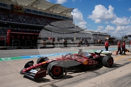 Ferrari driver Charles Leclerc of Monaco pulls into the pits during a practice session the Formula One U.S. Grand Prix auto race at the Circuit of the Americas, Friday, Oct. 17, 2025, in Austin, Texas. (AP Photo/John Locher)
