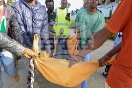 People evacuate an injured man after chaos erupted during the public viewing of the body of former Kenya Prime Minister Raila Odinga, who died of a heart attack in India at the age of 80, at Kasarani Stadium in Nairobi, Kenya, Thursday, Oct. 16, 2025. (AP Photo/Andrew Kasuku)